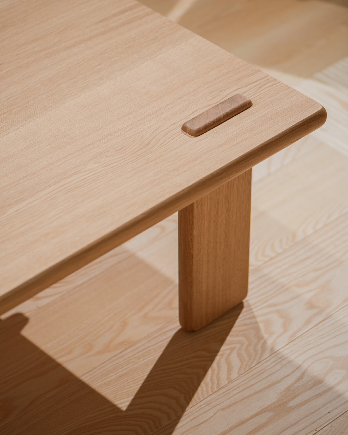 Rento-sohvapöydän muotoilussa voi aistia jotakin perinteistä, jopa talonpoikaiskalusteista tuttua. Samalla kuitenkin pöydän päätyjen ja kannen taidokkaasti viimeistellyt yksityiskohdat ammentavat japanilaisesta liitostekniikasta hienostunutta tarkkuutta.
