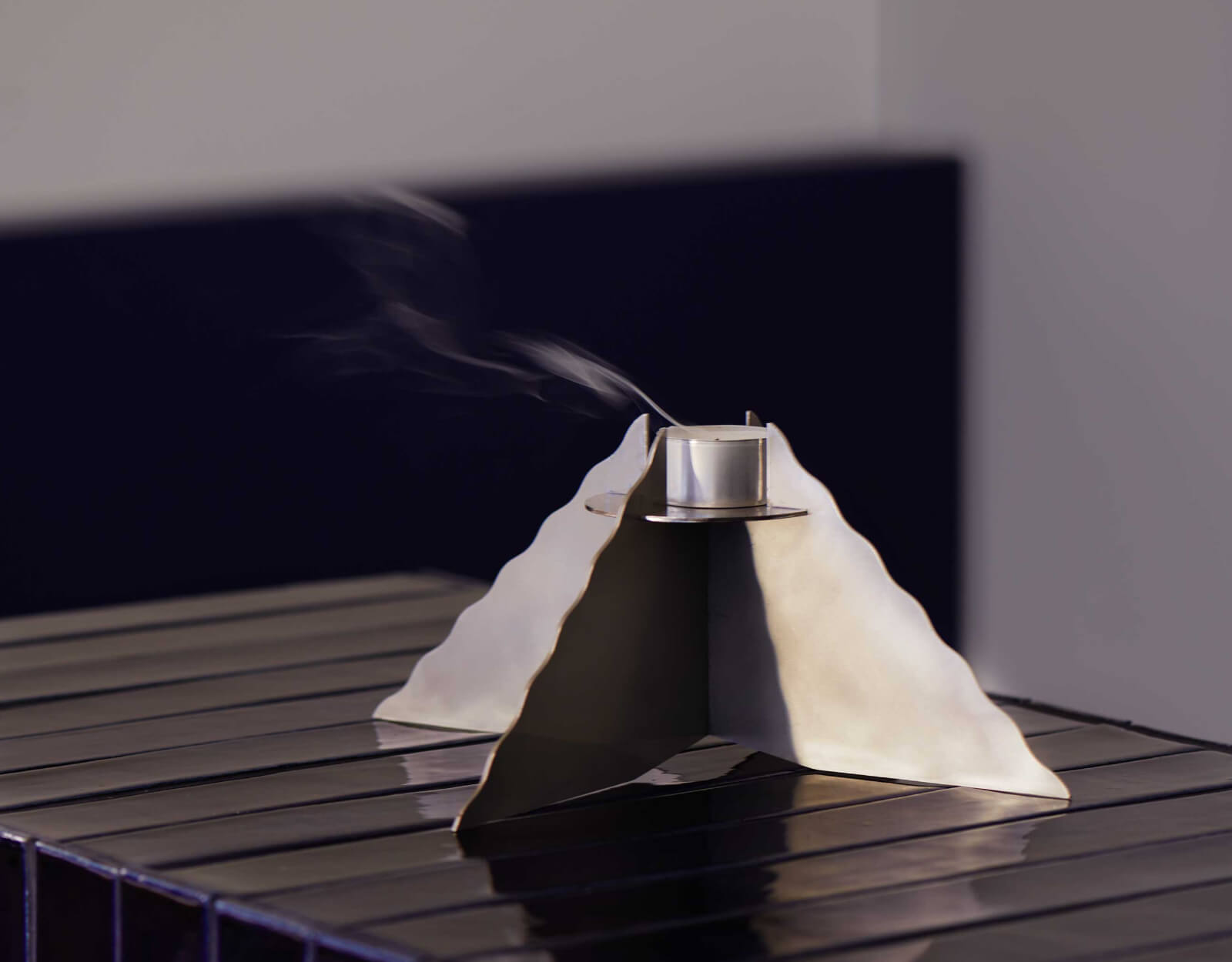 Muotoilija Reeta Laine on suunnitellut Fasetin valotuoteuutuuden, teräksestä valmistetun ja kokoon taittuvan Harmaja-kynttilälyhdyn.