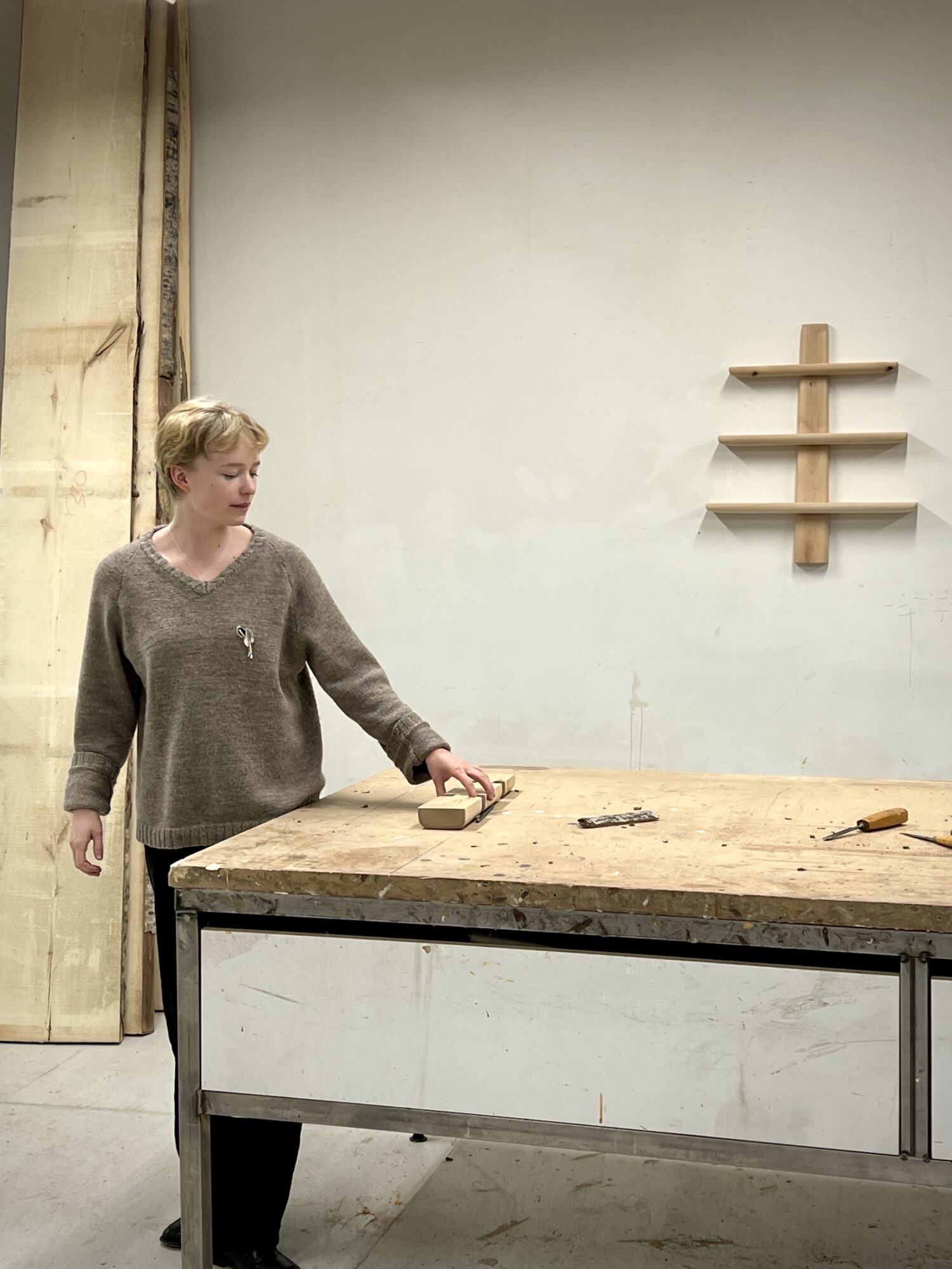 Hyllyn perusidea on yksinkertainen: keskellä on pystysuuntainen puuosa, johon hyllytasot asettuvat määrätyin välein. Muoto ja rakenne ovat kehittyneet työstön myötä. Olen tehnyt hyllystä useita versioita, ja jokaisen myötä olen oivaltanut uusia ratkaisuja. Yksinkertainen rakenne on mahdollistanut työn luontevan kehittämisen. Ensimmäinen versio oli kahden kämmenen kokoinen, seinälle asetettava reliefi, josta hylly on vähitellen kehittynyt nykyiseen muotoonsa.