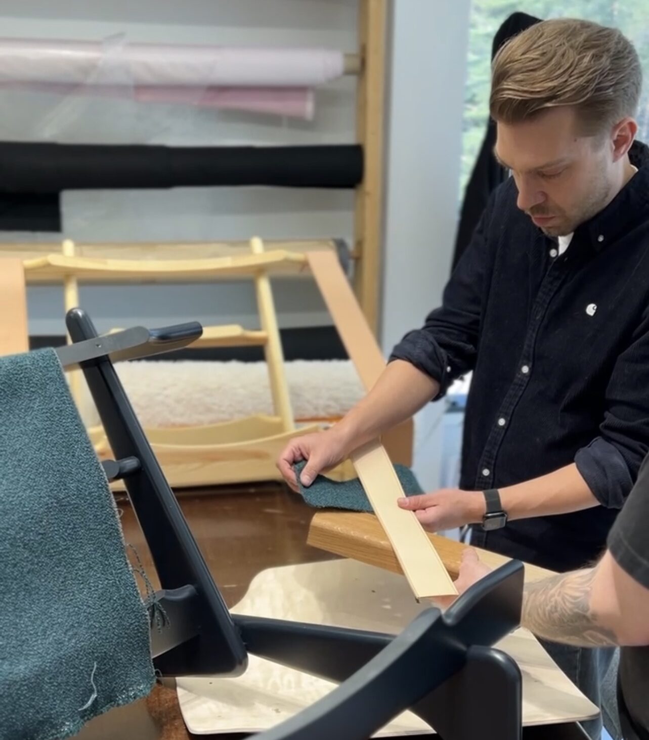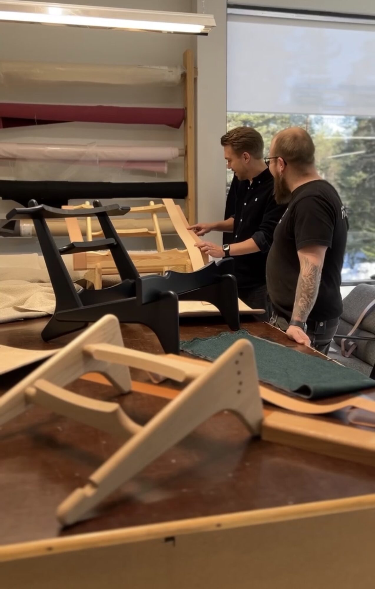 ”Kun menin Fasetille etsimään sopivaa sohvaa, ihastuin heti Jumbo-nojatuoliin. Keskustelun myötä syntyi idea suunnitella yhdessä näiden materiaalien yhdistelmä ja ryhtyä samalla testikäyttäjäksi. Oli todella siistiä päästä tutustumaan kaikkiin mahdollisiin materiaalivaihtoehtoihin ja nähdä Jumbon tuotantoprosessin kaikki vaiheet alusta loppuun.”
