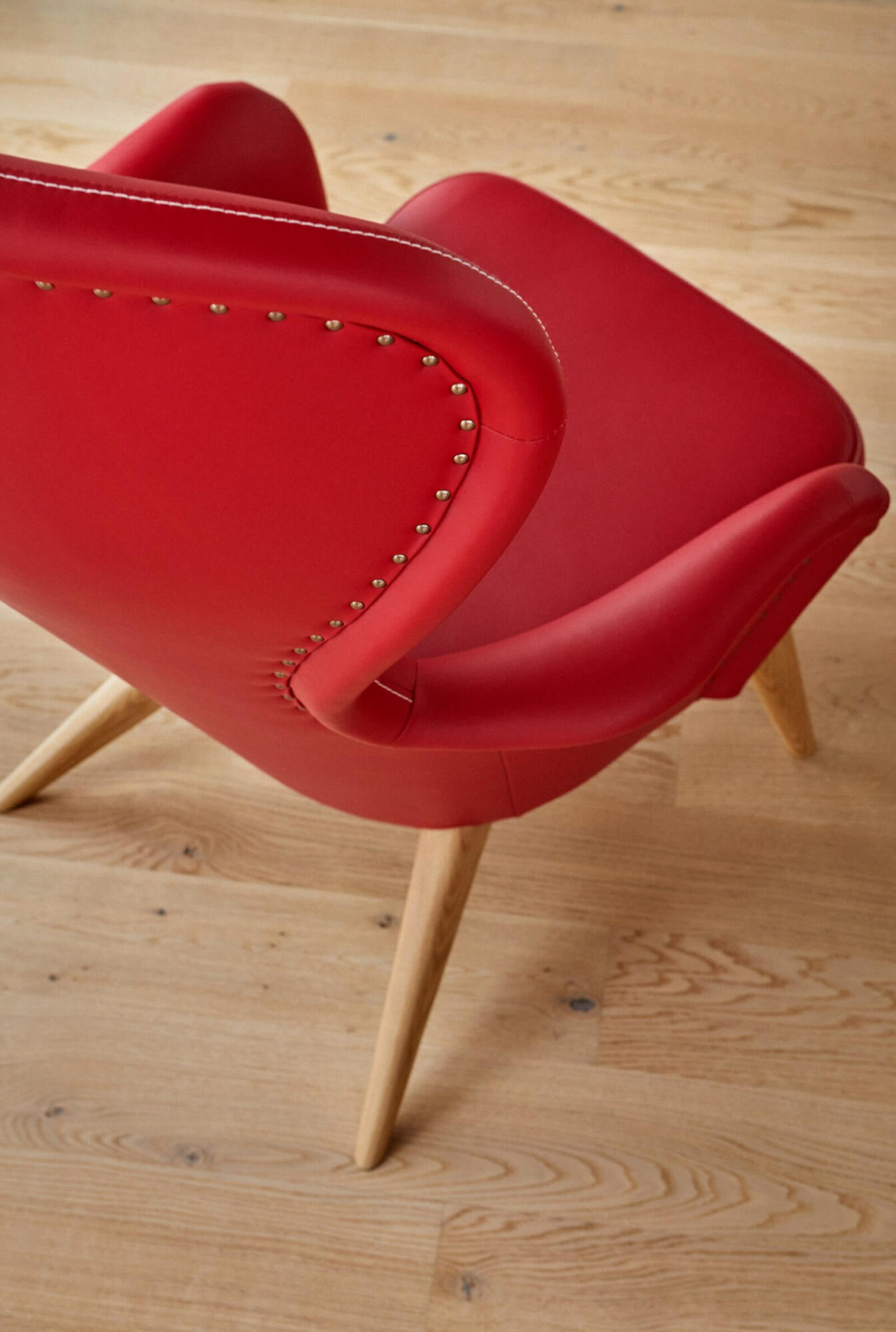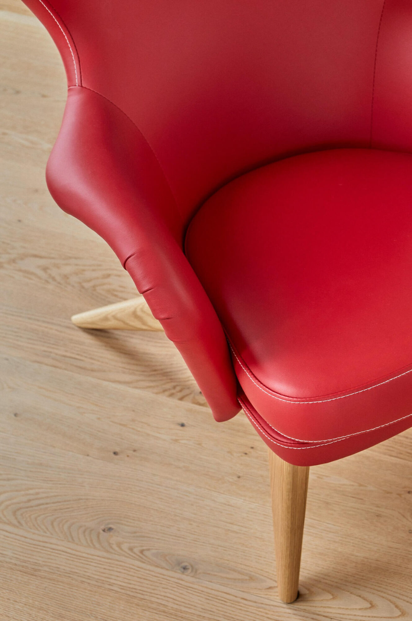 Asiakkaan toiveiden mukaan valmistettu, punaisella nahkalla verhoiltu Siesta tuoli.