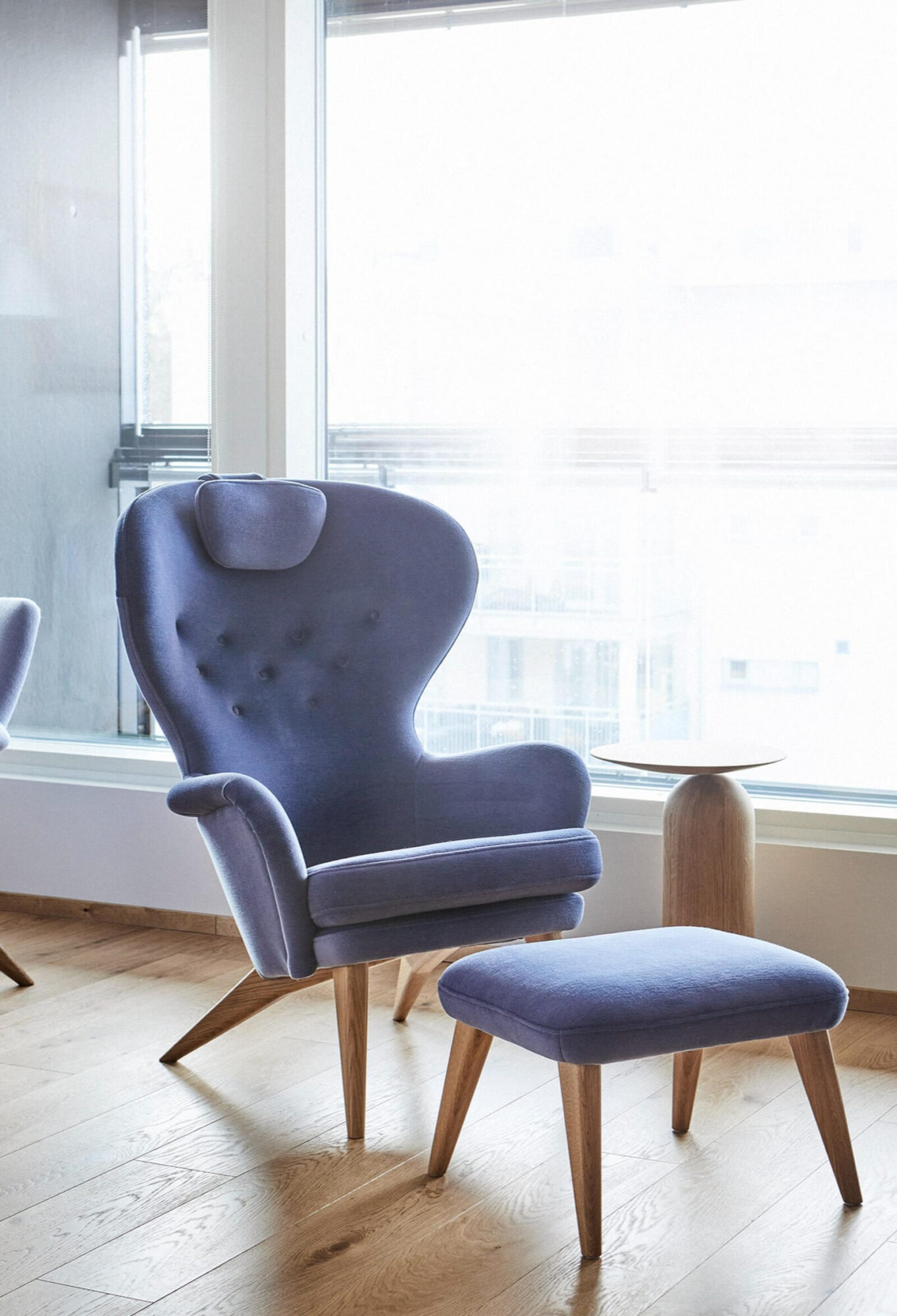 Ornäs Pedro tuoli ja sohva Vidar villakankaalla verhoiltuina.