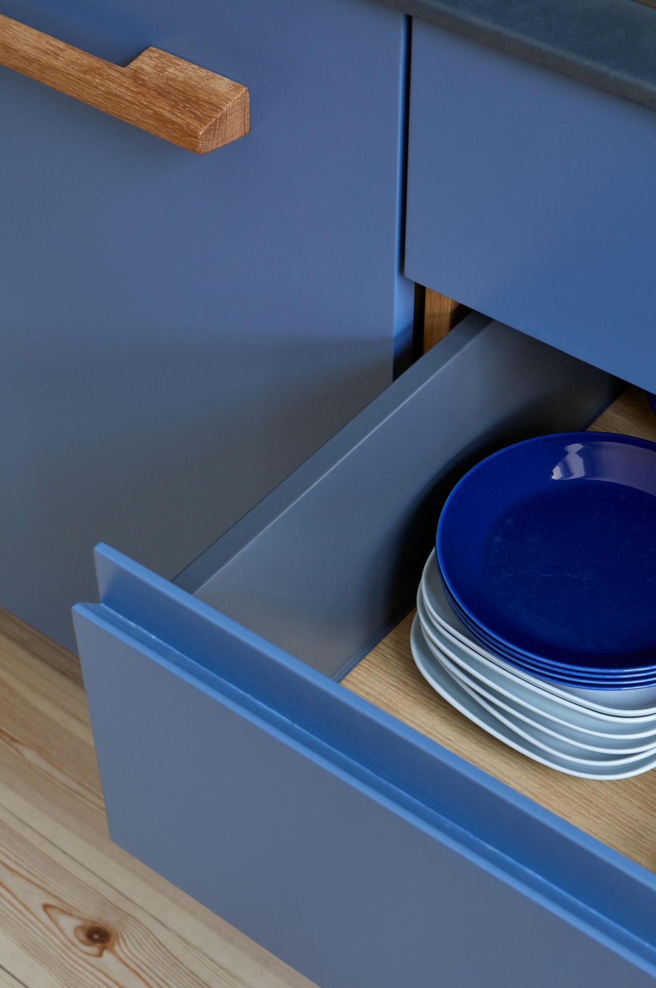 Fasetissa mittatilauksena asiakkaalle valmistettu keittiö on seinän sävyyn maalattua kalustelevyä.