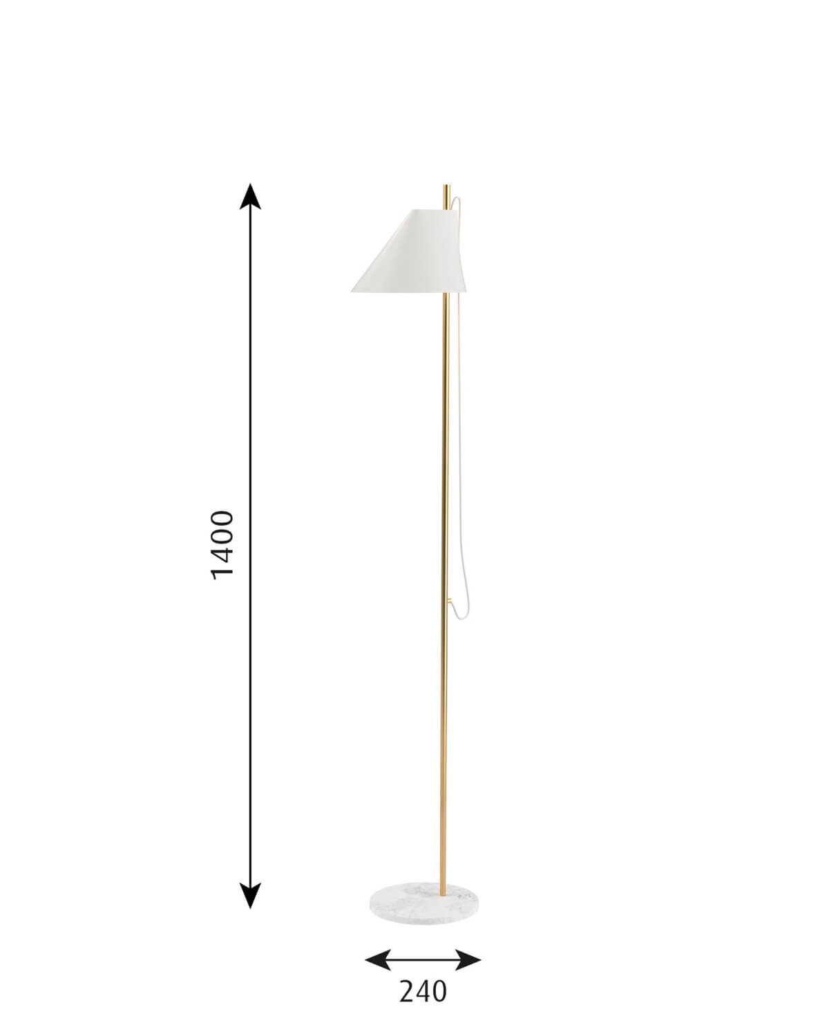 Yuh-valaisimen varjostinta voi nostaa, laskea, pyörittää ja kallistaa pystysuoran tukitankonsa varassa, mikä mahdollistaa valon ihanteellisen suuntaamisen. Pelkistetty varjostinmalli tuottaa suoraa, häikäisemätöntä alaspäin suuntautuvaa valoa, kun taas varjostimen yläosan ohut aukko luo pehmeää, ylöspäin suuntautuvaa tunnelmavaloa. Valaisimen messingistä ja marmorista valmistettu jalka lisää ylellistä eleganssia.