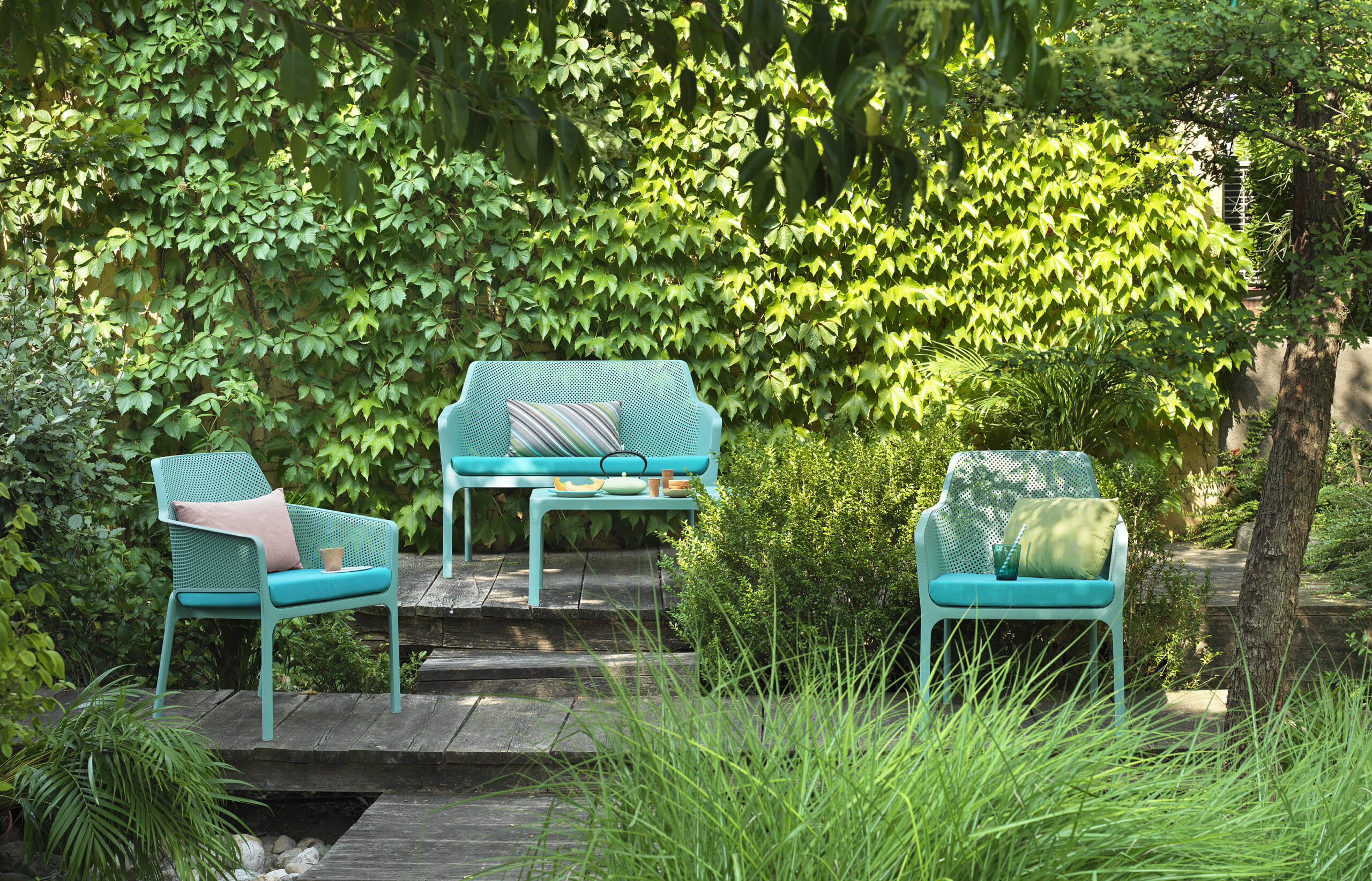 Net Bench on kierrätettävästä lasikuituvahvistetusta polypropeenista valmistettu kaksipaikkainen ulkosohva, jonka istuinta ja selkänojaa koristaa säteittäiset neliönmuotoiset reiät. Sohva on mattapintainen ja miellyttävän tuntuinen, ja siinä on selkeät linjat ja tyylikäs muotoilu.