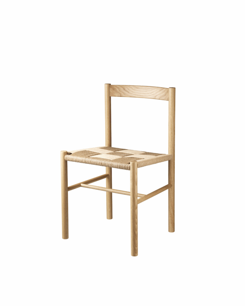 Näyttely-tuolin käsin punottu selkänoja antaa tuolille hienostuneen ilmeen. Samalla se toimii visuaalisena vastavetona tuolin minimalistisille linjoille.