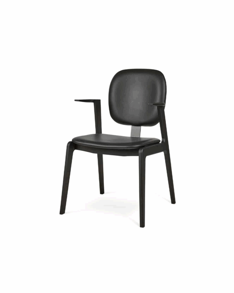 Näyttely-tuolissa istuu mielellään pidemmänkin illallisen ajan. Nahkainen selkänoja tukee istujaa ja verhoiltu, pehmustettu istuinosa lisää tuolin mukavuutta.