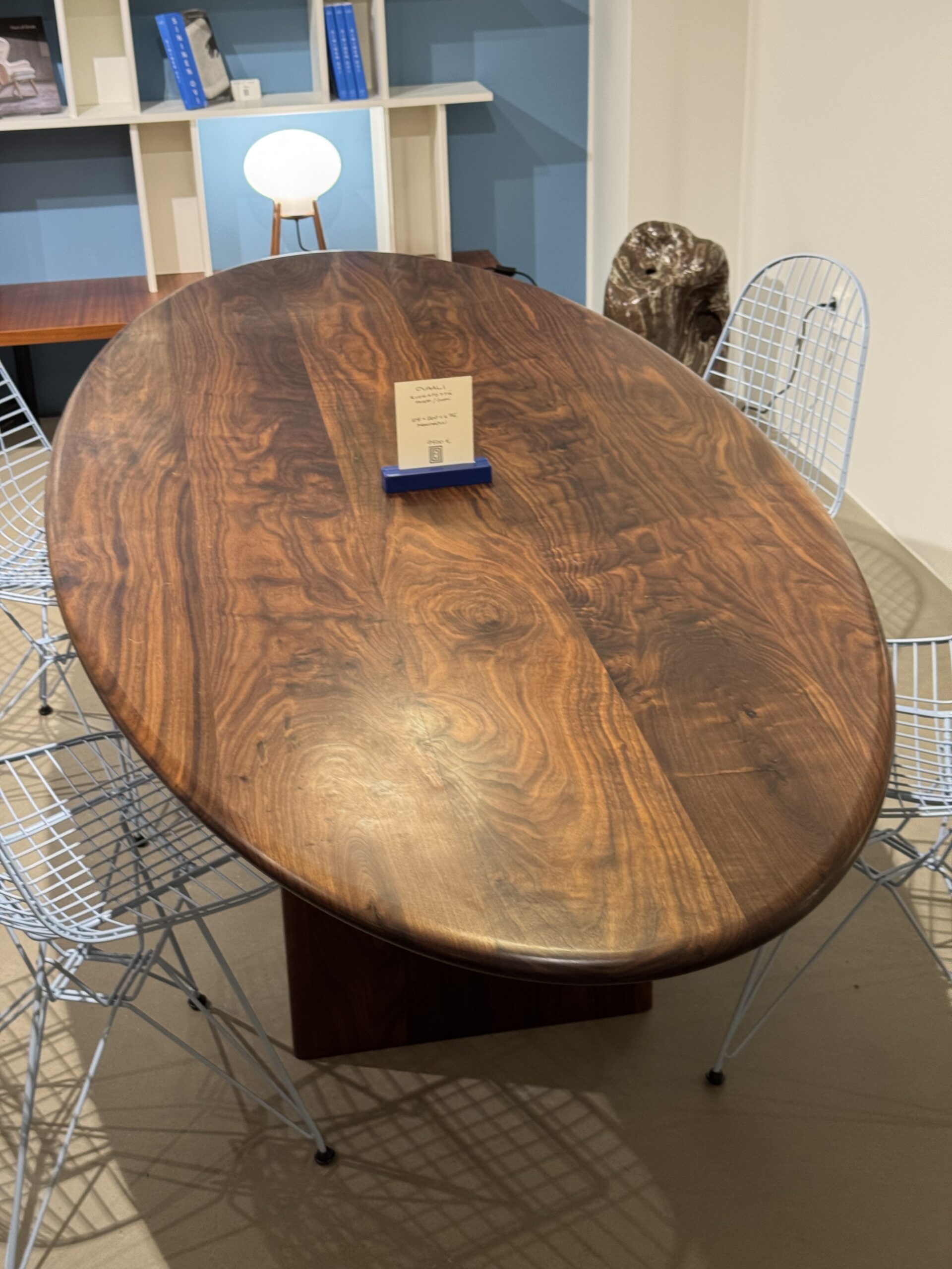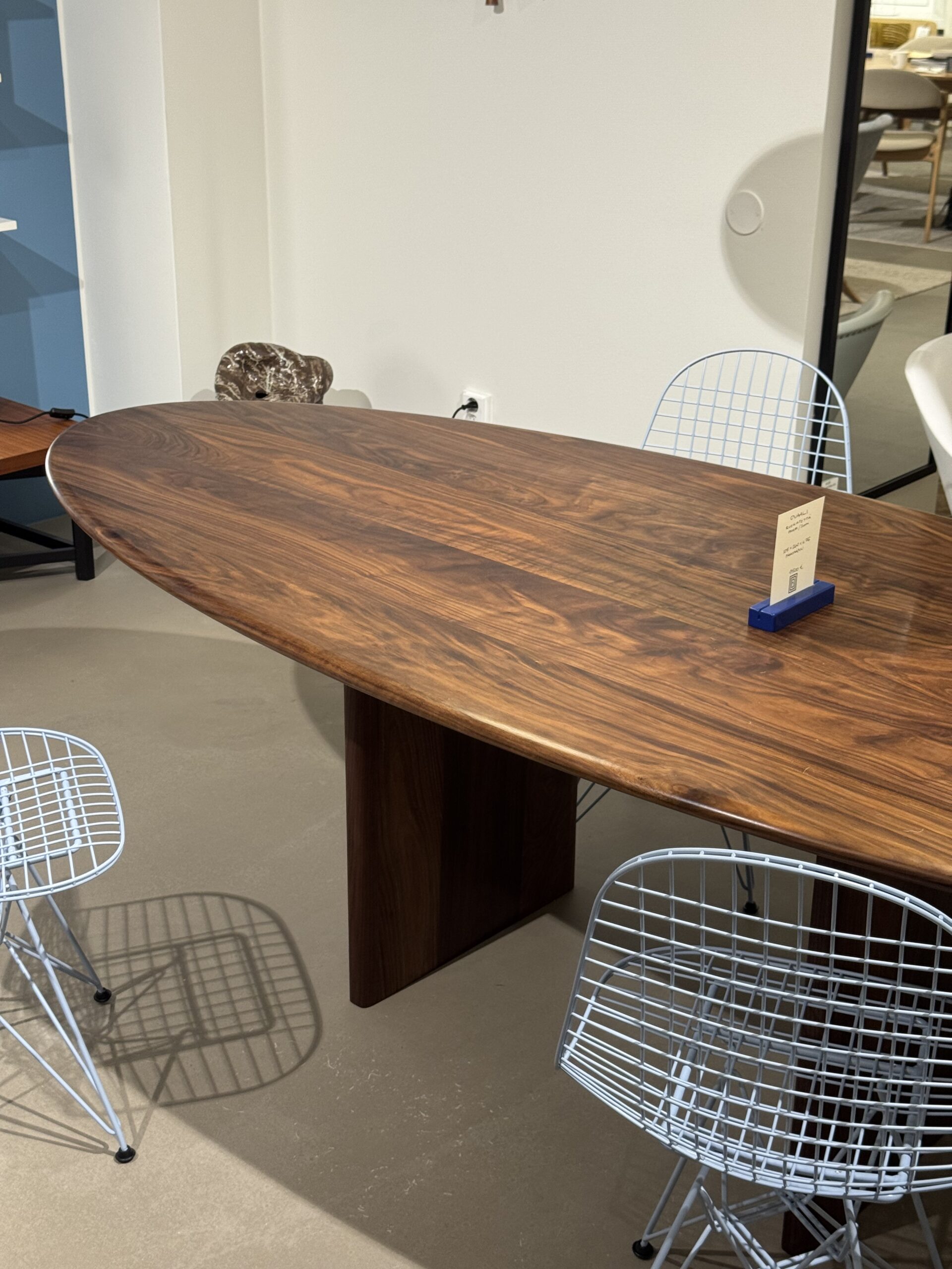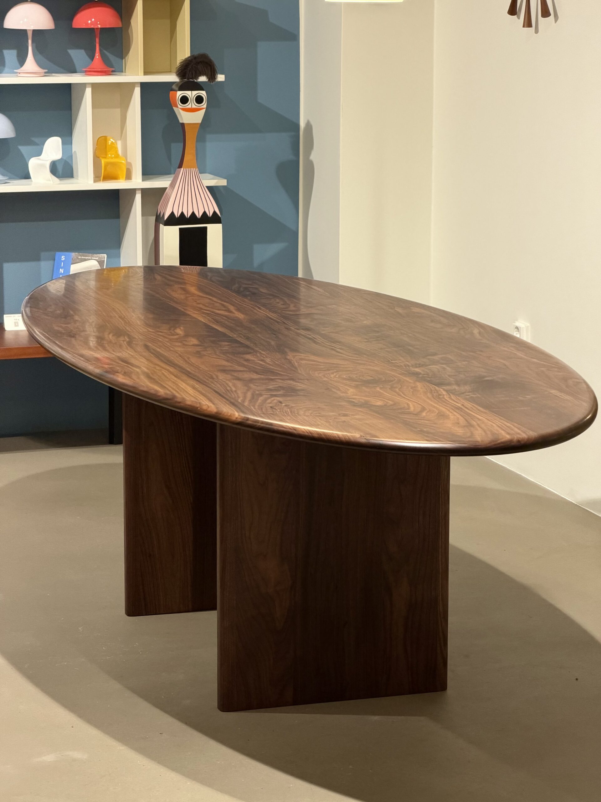Fasetti Design Studion ja Pasi Kärkkäinen-Tunkelon suunnittelema uniikki ovaali ruokapöytä. Todellinen puusepän taidonnäyte. Valmistettu öljytystä massiivipähkinästä.