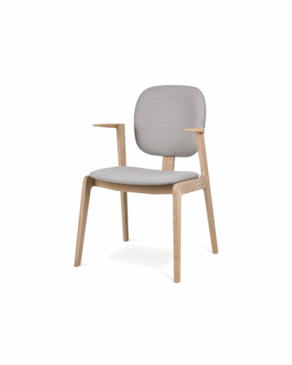 Tuolin runko on valmistettu korkealaatuisesta massiivipuusta ja sen muotoilu on samaan aikaan selkeä ja kutsuva. Verhoiltu istuin ja joustava selkänoja tarjoavat erinomaisen istumismukavuuden, myös pidemmillä illallisilla tai kokouksissa. Hienovaraisesti muotoillut käsinojat tukevat mukavasti, säilyttäen samalla kevyen ilmeen.