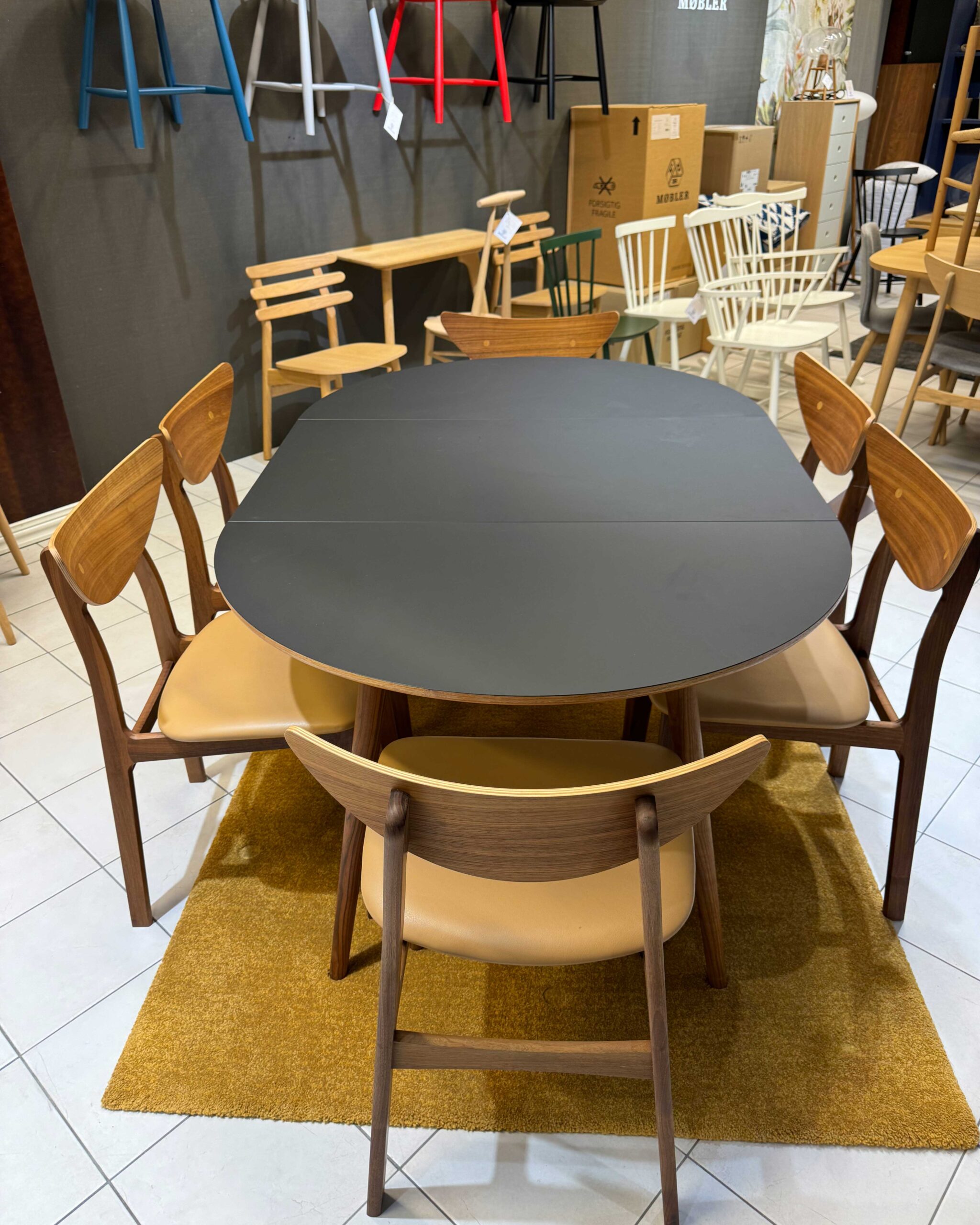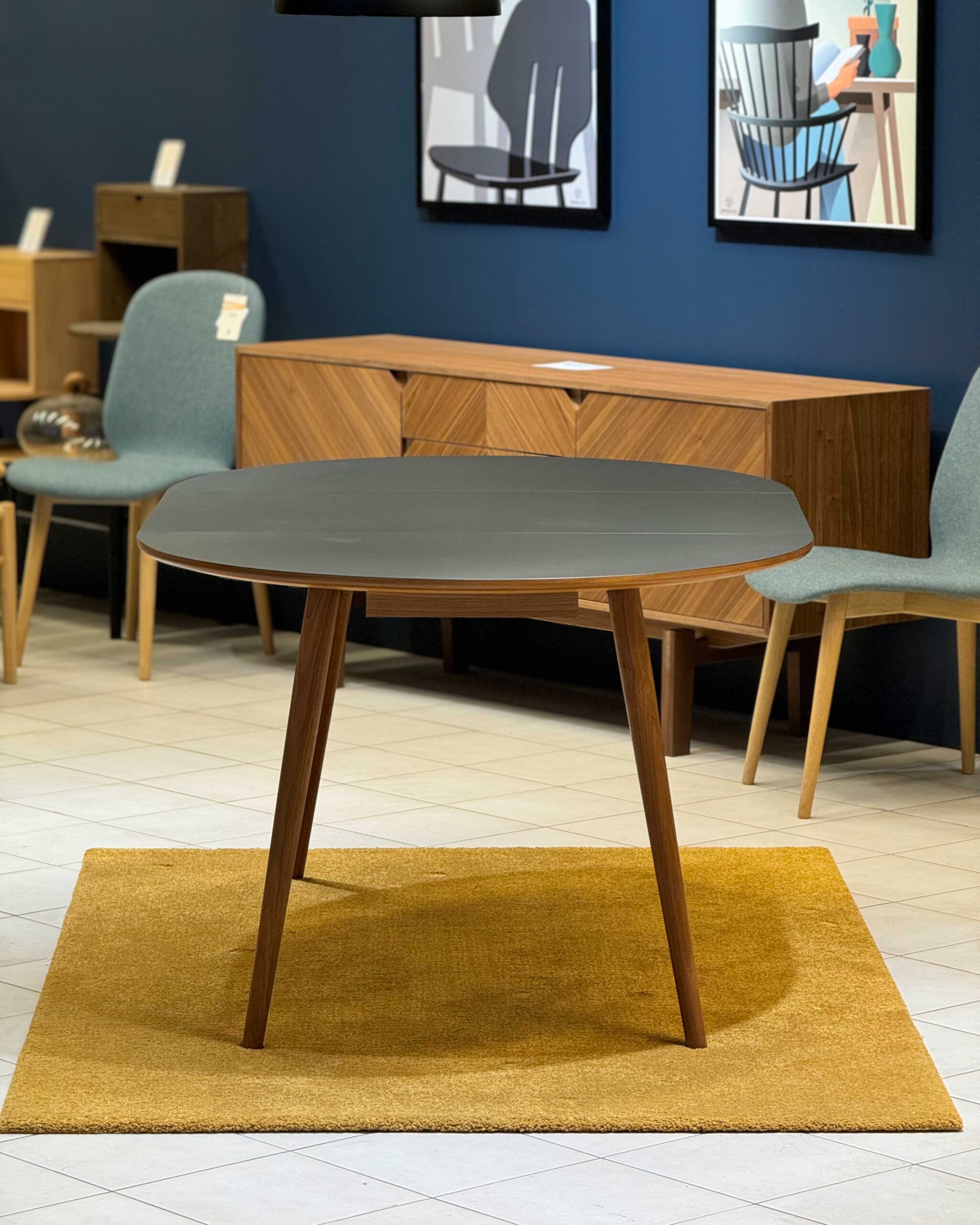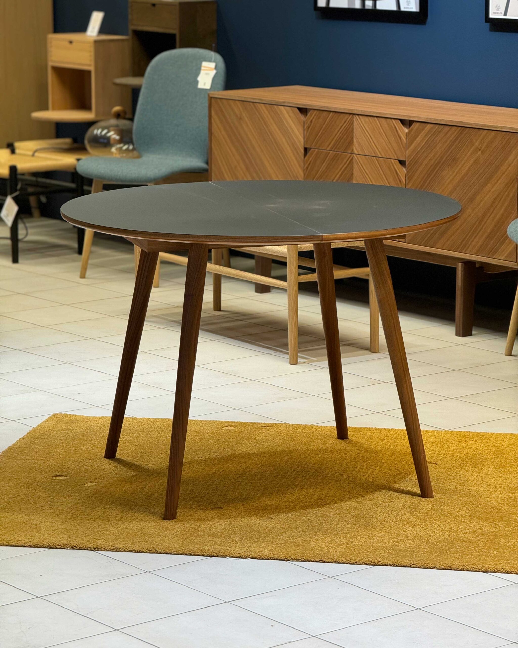 PBJ Designhousen pyöreä, jatkettava ruokapöytä. Jalat pähkinäpuuta, kansi laminaattia.